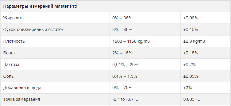 Анализаторы молока MASTER PRO серии – высококачественные устройства для измерений девяти компонентов молока. Точный анализ компонентов производится за 60 сек. /40 сек. Встроенная клавиатура для ввода данных (литры, количество поставщиков). Три канала для калибровки. Стандартные калибровки для анализатора Master Pro для коровьего молока, овечьего молока и UHT. Анализатор может быть откалиброван также для: буйволиного молока, пастеризованного молока, козьего молока, смеси, обезжиренного молока, сыворотки и других видов молока и молочных производных.