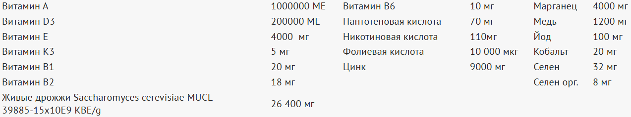 благодаря витаминам группы В способствует стабилизации рубцовой микрофлоры и улучшает ферментацию кормов